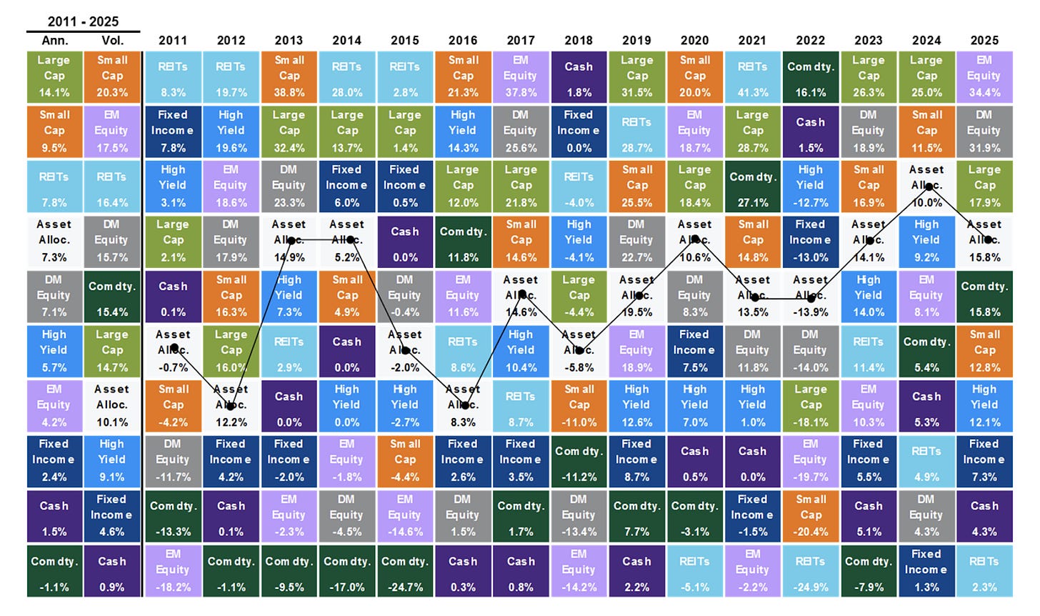 The quilt chart shows why chasing last year’s winner is one of the most expensive mistakes investors make.