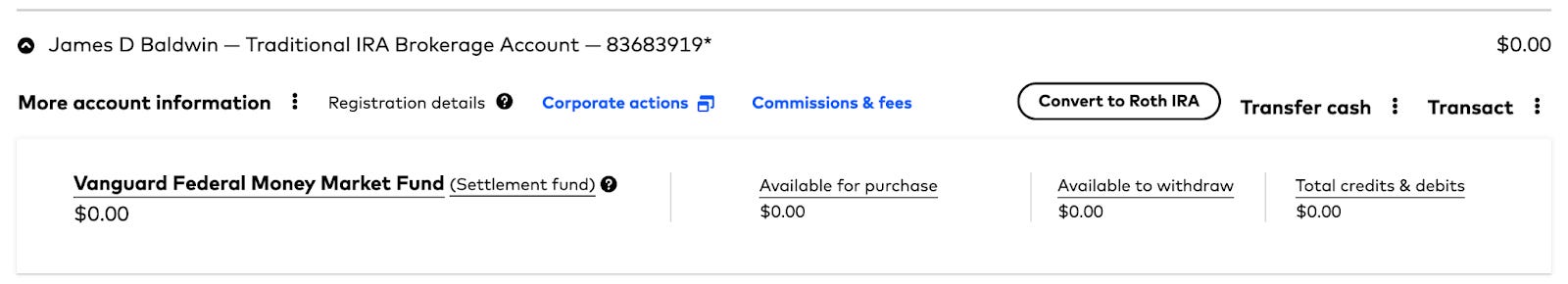 Open the Accounts. Open a “Traditional IRA” and a “Roth IRA” with your investment brokerage. You need both accounts. If you don’t have one, Vanguard and Fidelity are good options.