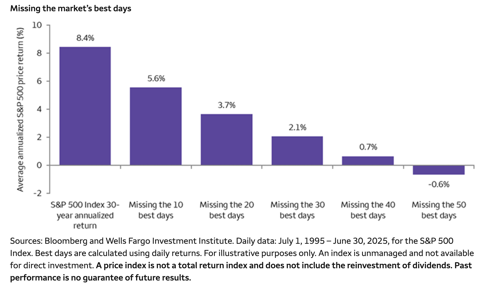 When you are sitting on the sidelines, you could be missing some of the market’s best days, and that matters a lot. The research below from Wells Fargo shows that missing just the best 10 days in a 30-year period would cut your return by a third, from 8.4% to 5.6%, and it gets worse from there2.