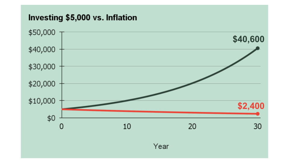 Because when money sits uninvested, it’s getting eaten by inflation. For example, $5,000 invested for 30 years at a 7% return could grow to about $40,600. But uninvested, an inflation rate of 2.5% would reduce the value to $2,400.