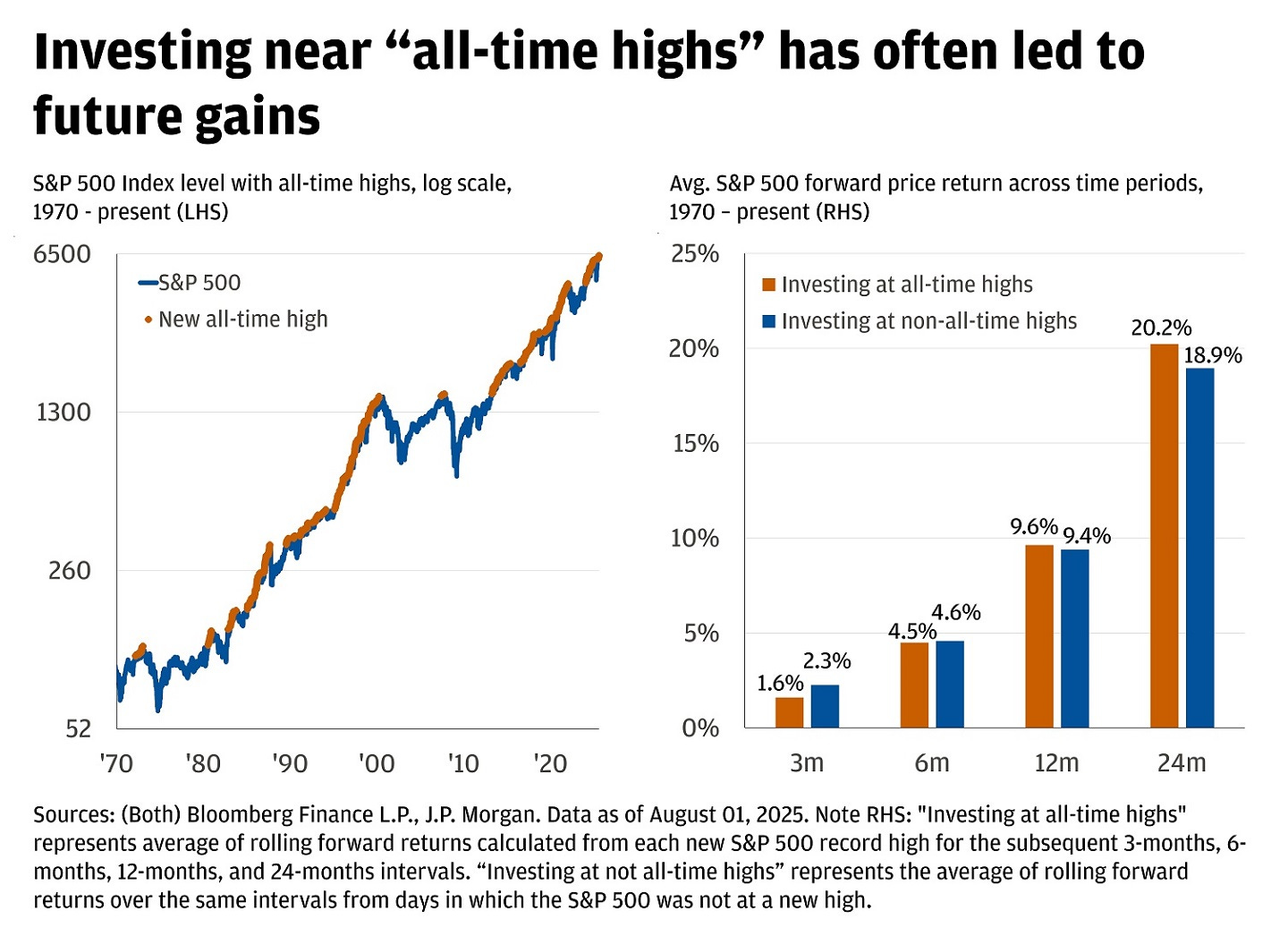 Let’s start with looking at the fears of a bubble or that the market’s all-time highs mean we are ‘due’ for a correction. The high valuations may seem scary, but they are very common. Consider this analysis by JP Morgan1. Even when people invest at all-time highs, they tend to perform better over the next few years.