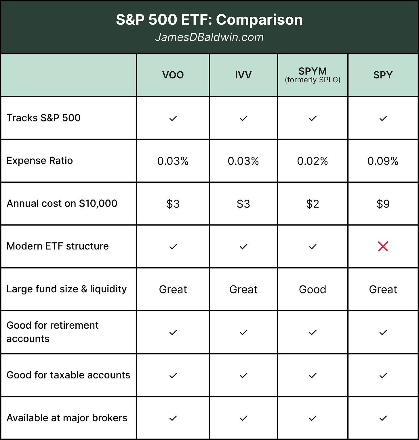 In 401(k)s, use the low-cost S&P 500 index option available. You usually won’t have a choice between these specific ETFs anyway.