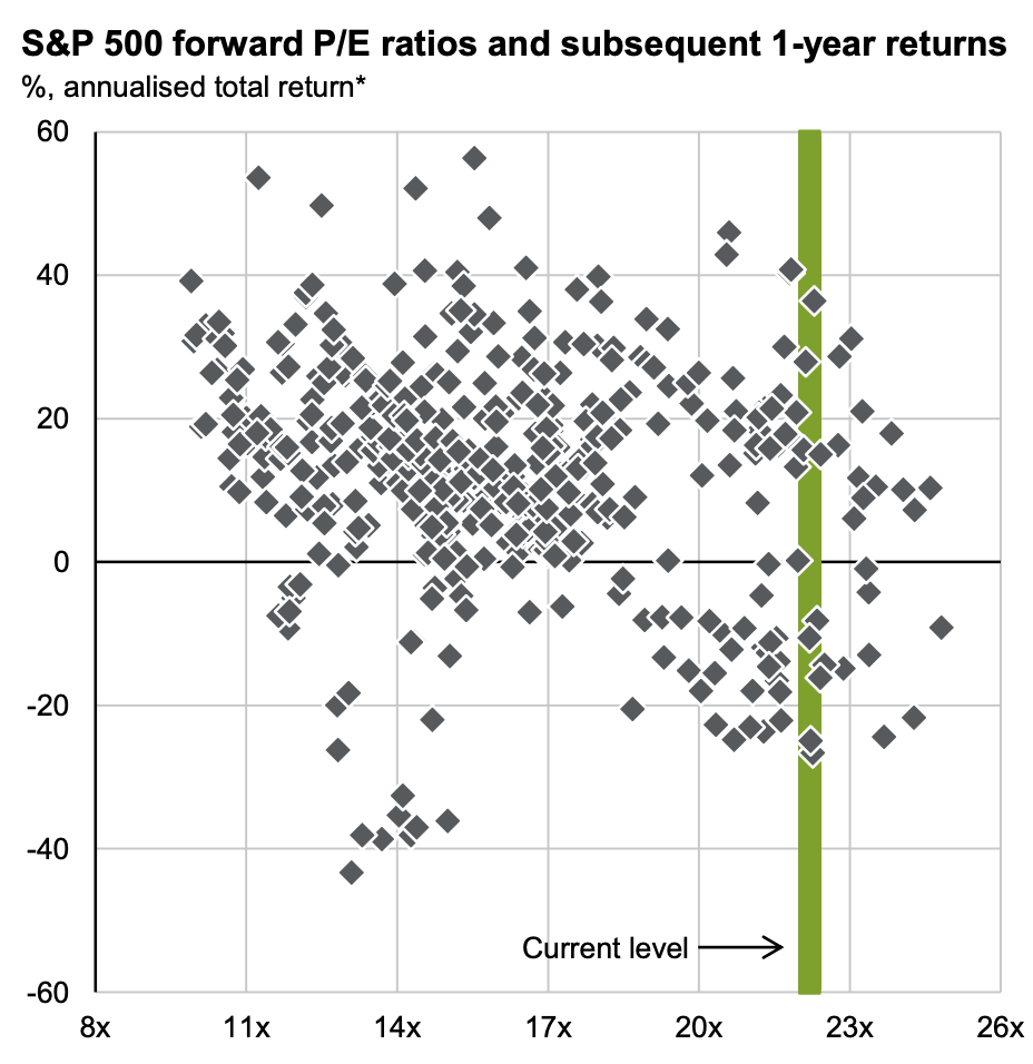 Valuations tell us very little about what happens next year. Even at high starting valuations, one-year returns have ranged from deep losses to gains over +40%.